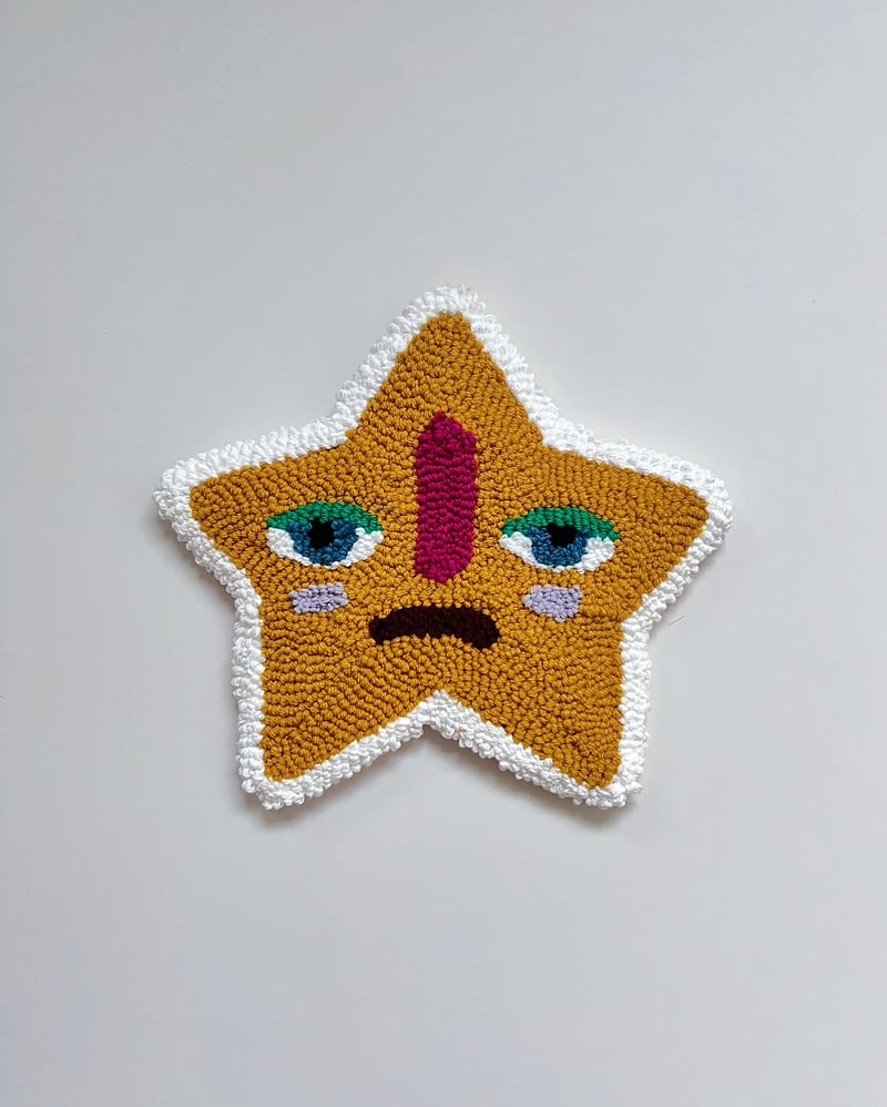 This hand-tufted star measures 11" across and doubles as both a Christmas tree topper and a wall hanging. It’s reinforced internally so it stands tall on your tree, with a little pocket in the base to slide the top branch into. When the holidays are over, a D-ring on the back allows you to hang him on your wall and enjoy him all year long.