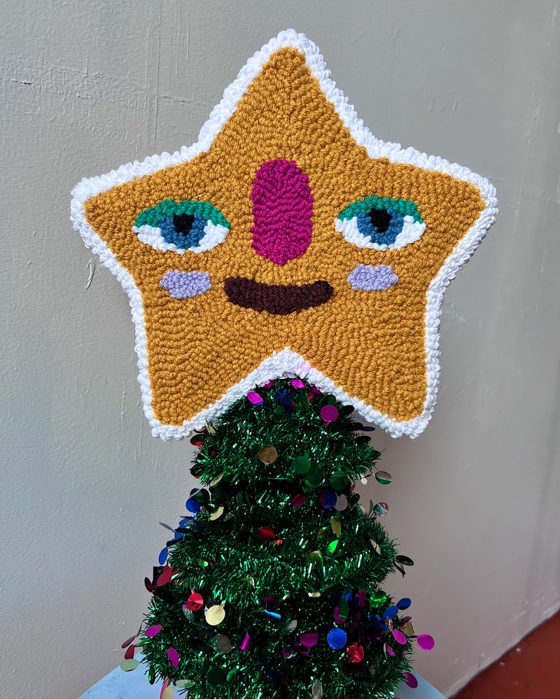 This hand-tufted star measures 11" across and doubles as both a Christmas tree topper and a wall hanging. It’s reinforced internally so it stands tall on your tree, with a little pocket in the base to slide the top branch into. When the holidays are over, a D-ring on the back allows you to hang him on your wall and enjoy him all year long.