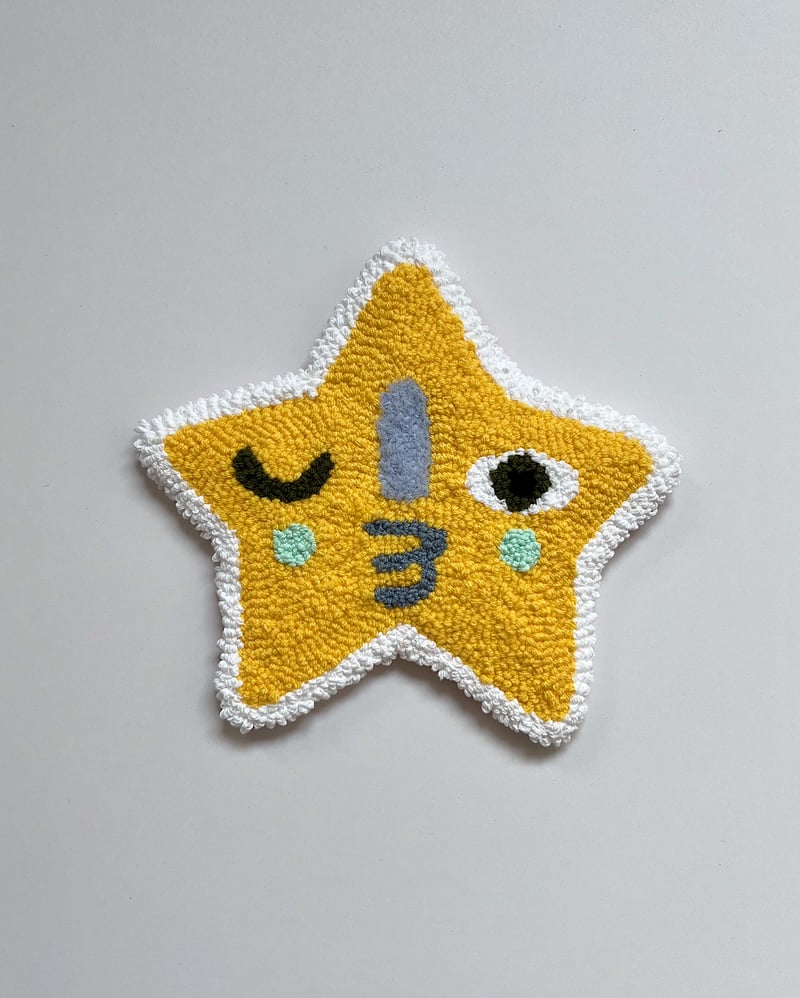 This hand-tufted star measures 11" across and doubles as both a Christmas tree topper and a wall hanging. It’s reinforced internally so it stands tall on your tree, with a little pocket in the base to slide the top branch into. When the holidays are over, a D-ring on the back allows you to hang him on your wall and enjoy him all year long.